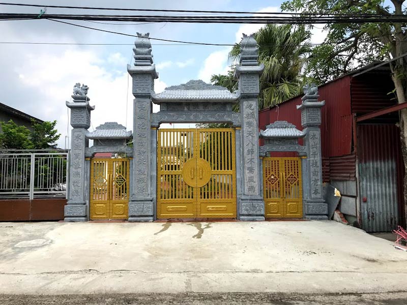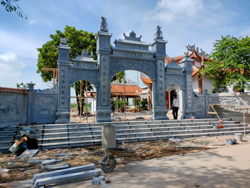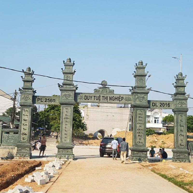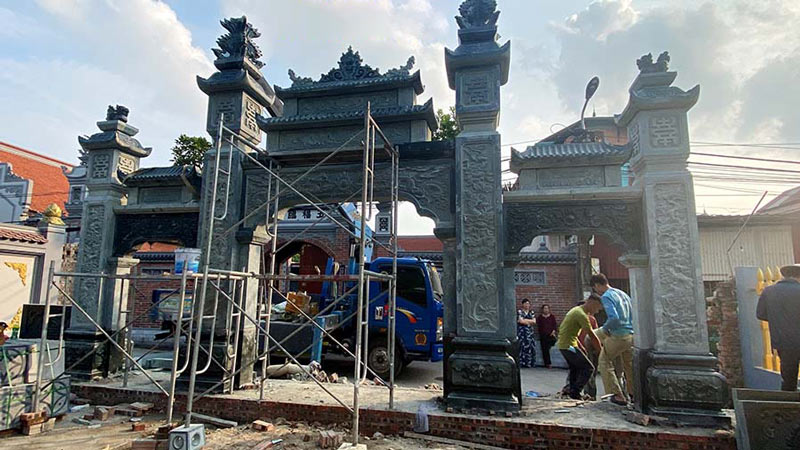 Cổng tam quan đá thường được chế tác từ đá xanh Ninh Bình, đá granite hoặc đá cẩm thạch.