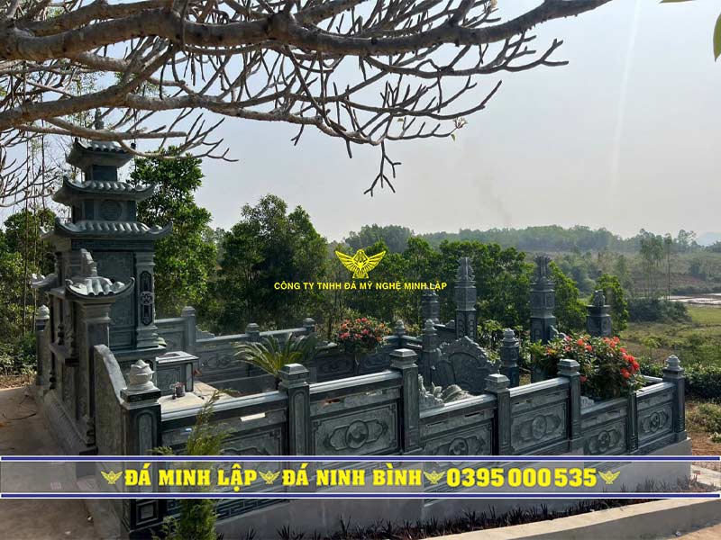 mẫu lan can đá xanh rêu với hoa văn chữ Tâm , nhìn bên ngoài không rối mắt mà sắp xếp có trật tự, tạo cho không gian tâm linh không chỉ đẹp mắt mà còn có tính phong thủy cực tốt, giúp gia chủ ở trong đó luôn yên tâm được che chở